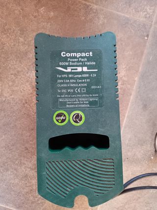Balastro compacto Venture Lighting de 600W para lámparas de halogenuros metálicos (MH) o de vapor de sodio de alta presión (HPS). Está en perfecto estado. - Funciona con lámparas de 600W. - Clase de aislamiento H. - Protección IP20. - Incluye cable de alimentación.
