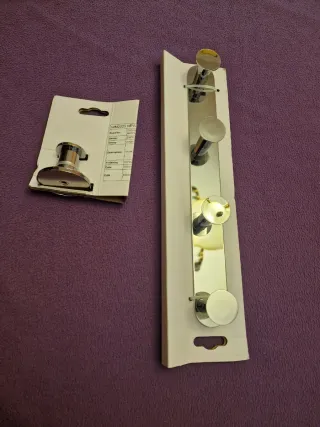 Set de colgadores para baño con acabado cromado brillante. Incluye un colgador individual y un soporte con tres ganchos. - Nuevos en su embalaje - Colgador individual con base redonda. - Soporte de pared con tres ganchos. - Acabado cromado.