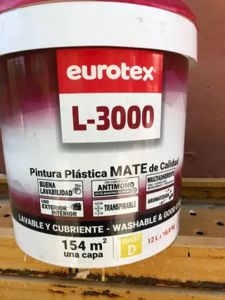 Pintura plástica mate de alta calidad, marca Eurotex, modelo L-3000. Ideal para interiores y exteriores. Azul cobalto - Acabado mate. - Buena lavabilidad. - Antimoho. - Transpirable. - Multiadherente. - Cubriente. - Rendimiento: 154 m² con una capa. - Base D. - Contenido: 12 L / 18,8 Kg.