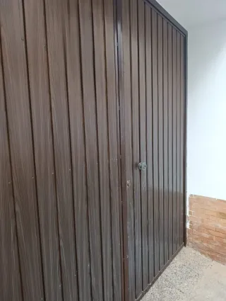 Puerta de garaje fabricada en chapa. - Diseño de lamas verticales. - medidas 250 x 245 - Acabado en color marrón.