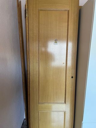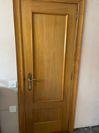 Preciosa puerta de madera maciza de la marca Uniarte. Ideal para dar un toque clásico y elegante a tu hogar. - Puerta de interior en madera. - Color roble. - Diseño con paneles moldurados. - Incluye manillas doradas. Medidas: 1 puerta de 2,03 x 0,725 con galce (con un pequeño desperfecto que se incluye en una foto) abre a izquierdas Tenemos los tapajuntas/ tapeta