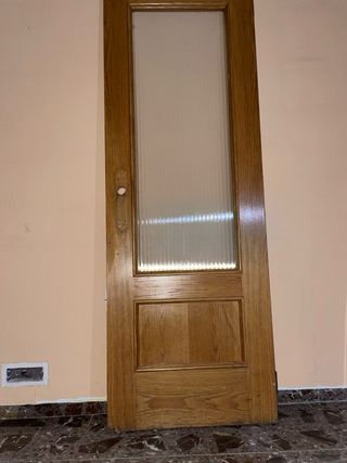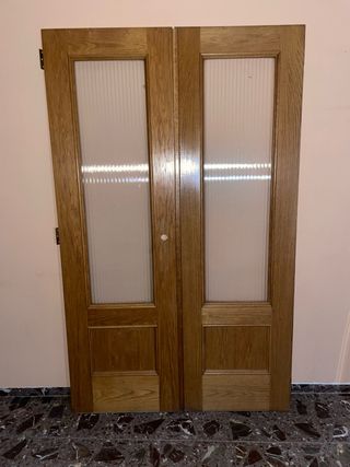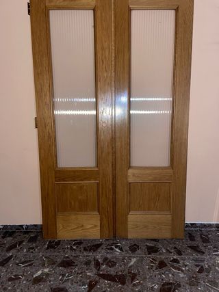 Conjunto de dos puertas interiores de madera con paneles de cristal. ALTURA 202 cm ANCHO 62cm cada una GROSOR 3,50 cm - Diseño clásico de dos paneles. - Cristal con acabado acanalado para privacidad. - Acabado en madera de roble.
