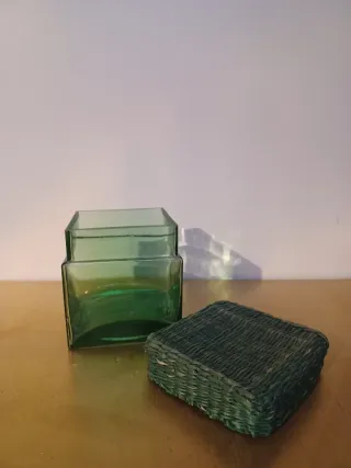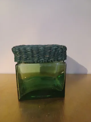Tarro o frasco de vidrio grueso en color verde. - Diseño cuadrado. - Taoa de tejido natural teñida verde