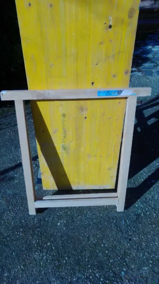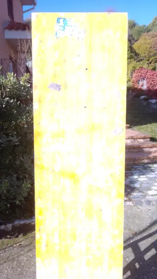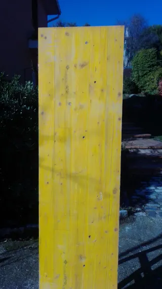2 tablas de madera tricapa amarillas, utilizadas comúnmente en construcción para encofrar. - Material de madera. - Color amarillo. - Superficie lisa con vetas visibles. Precio por unidad.