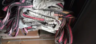 Lote de sacos de obra (20/25), ideales para transporte de escombros o materiales de construcción. Están fabricados con un material resistente y cuentan con asas reforzadas para facilitar su manejo. - Material de polipropileno tejido. - Diseño con franjas de colores (rosa, negro, blanco). - Asas para un agarre seguro.