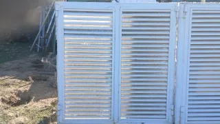 Puerta metálica de doble hoja, ideal para fincas o accesos. - Estructura de barrotes verticales. - Parte inferior con malla metálica. - Color verde desgastado con óxido visible.