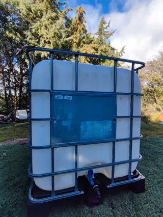 Contenedor de gran capacidad para líquidos. - Capacidad de 1000 litros. - Estructura metálica protectora. - Grifo de salida. - Material blanco opaco.