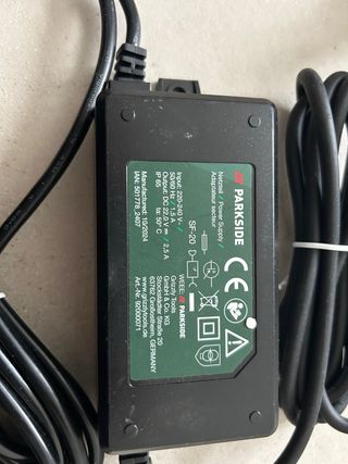 Adaptador de corriente Parkside SF-20. - Entrada: 220-240 V~, 50/60 Hz, 1,5 A. - Salida: DC 22,0 V / 2,5 A. - Protección IP 65. - Fabricado: 10/2024. - IAN: 501778_2407. - Fabricante: Grizzly Tools GmbH & Co. KG, Alemania. - Número de artículo: 92000071.
