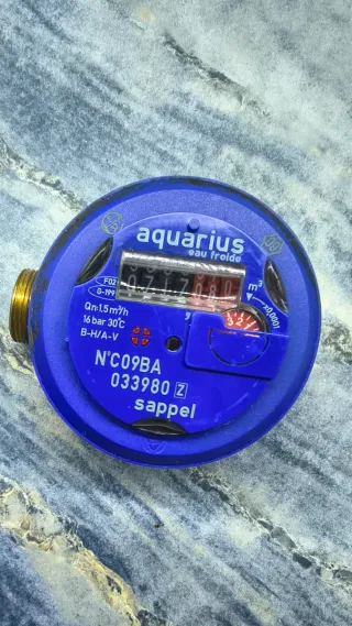 Contador de agua fría marca Aquarius. - Modelo: N°C09BA 033980 Z - Caudal nominal (Qn): 1,5 m³/h - Presión máxima: 16 bar - Temperatura máxima: 30°C - Unidad de medida: m³