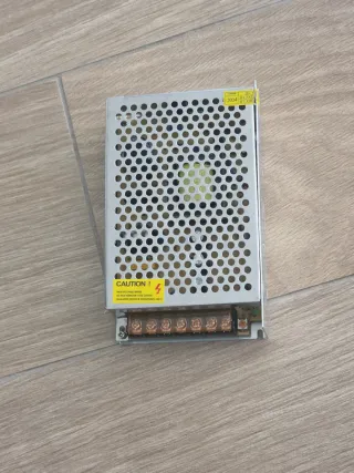 Fuente de alimentación conmutada de 12V, ideal para tiras LED y otros dispositivos. - Carcasa metálica con ventilación. - Terminales de conexión de tornillo. - Etiqueta de advertencia de alto voltaje.