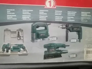 Kit de herramientas eléctricas que incluye un taladro percutor, una sierra de calar y una lijadora orbital. Ideal para trabajos de bricolaje y reparaciones en el hogar. - Taladro percutor de 500W. - Sierra de calar de 350W. - Lijadora orbital de 135W. - Incluye maletín para transporte y almacenamiento.