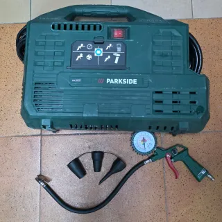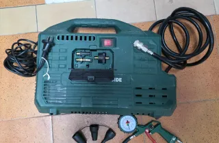 Compresor compacto Parkside PKZ 180 C5. Incluye pistola con manómetro y varios adaptadores. - 1100w, 8bar de presión, 180 L/min. - Diseño portátil y robusto. - Pistola de inflado con manómetro nuevo a estrenar. - Adaptadores para diferentes usos. Tiene la carcasa dañada pero no afecta al funcionamiento (lo compré así en un Lidl Factory). Infla las ruedas del coche muy rápido. Ideal para garages/trasteros y para inflar ruedas de bicicleta de forma rápida. Ideal tubelizar ruedas para un punch inicial fuerte. No se rebaja más, ya se ha tenido en cuenta la rotura estética de la carcasa. Las comisiones de envío es cosa de Wallapop.