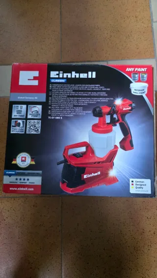 Pistola pulverizadora eléctrica Einhell TC-SY 600 S a estrenar. - Sistema de pulverización para barnices, esmaltes y pinturas de interior. - Incluye correa para el hombro. - Regulación del flujo de pintura.