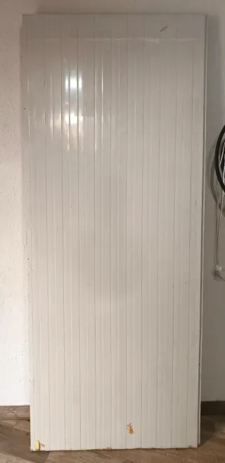 Puerta metálica de cochera, ideal para garajes o accesos. - Color gris claro. - Diseño con paneles. - Incluye cerradura y manilla.