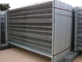 Conjunto de vallas metálicas para obra. Son robustas y fáciles de instalar. - Material: Metal galvanizado. - Diseño: Tubular y con malla. - Uso: Cierre y delimitación de espacios.