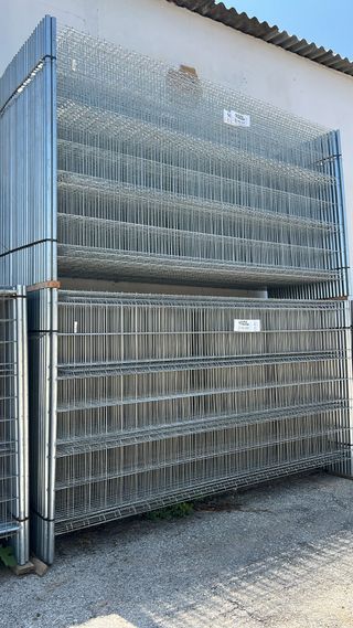 Conjunto de vallas metálicas galvanizadas, ideales para obras o eventos. - Material: Metal galvanizado. - Diseño: Malla electrosoldada. - Estructura: Reforzada con postes verticales.