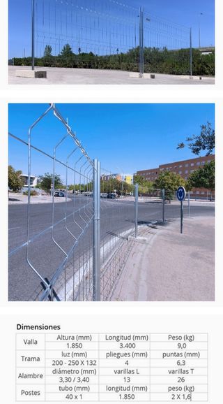 Conjunto de vallas metálicas para obra o eventos. Son fáciles de instalar y proporcionan seguridad. - Estructura de malla electrosoldada. - Postes de sujeción metálicos. - Bases de hormigón aparte Tambien las instalamos precio depende de los m² Incluye el porte en valencia si son mas de 50 vallas Medidas 3,50 de largo 1,90 de alto