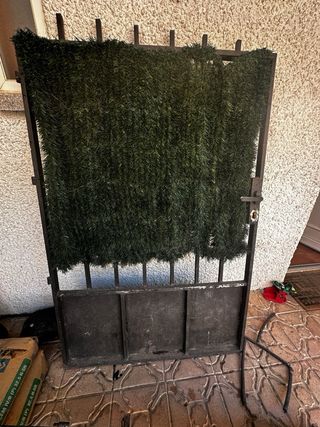 Preciosa puerta de jardín con valla incluida, ideal para decorar tu espacio exterior. Es una pieza única que añadirá un toque de estilo a tu jardín. - Estructura de metal resistente. - Revestimiento de plástico verde que imita a una planta. - Perfecta para crear privacidad o delimitar zonas.