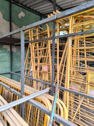 Valla limitadora de obra, color amarillo. Ideal para señalizar zonas de trabajo o delimitar espacios. - Medidas: 2,50m de largo x 1m de alto. - Fabricada en metal resistente. - Color amarillo intenso y llamativo. Nos costó 55€ en Leroy Merlín, está como nueva porque se ha usado sólo para un montaje teatral.