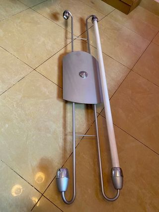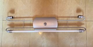 Lámpara con dos tubos fluorescentes y carcasa metálica. - Diseño moderno y alargado. - Acabado en metal plateado. - Se vende por cambio de modelo, le falta un tubo que se rompió al desmontarla.