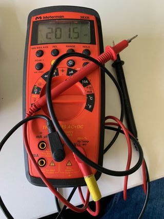 Multímetro Amprobe 38XR-A en color rojo. Incluye puntas de prueba. - Pantalla digital azul. - Botones de control: MIN MAX AVG, REL, RANGE, HOLD, PEAK+. - Selector de funciones giratorio. - Conexiones para mA, µA, 10A, COM, VΩHzTemp, dBm%. - Indicador de True RMS AC+DC.