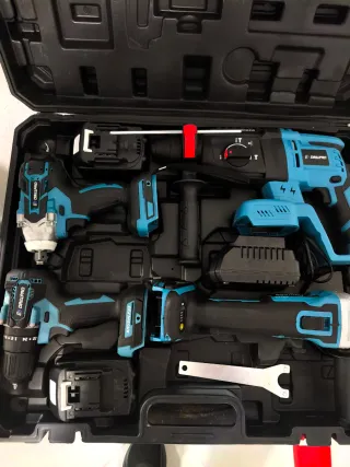 Maletín de herramientas eléctricas con varios accesorios. - Maletín negro. - Herramientas de color azul y negro. - Incluye llave inglesa.