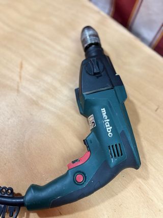 Taladro eléctrico de la marca Metabo. - Color verde y negro. - Mango ergonómico.