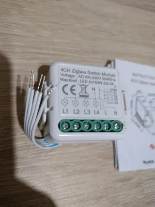 Módulo de interruptor inteligente con tecnología Zigbee para automatización del hogar. - Voltaje de operación: AC100-240V 50/60Hz. - Carga máxima para LED: 4x150W. - Corriente máxima por canal: 4x2.5A. - Certificación CE.