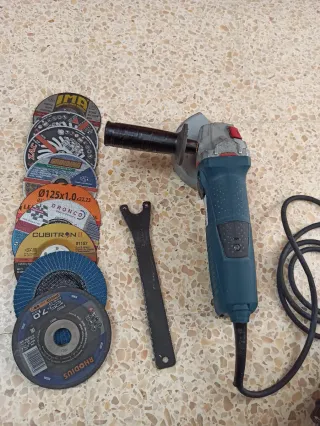 Amoladora angular Bosch GWS 11-125 CIE en perfecto estado y funcionamiento. Incluye 10 discos de corte y desbaste y pulir. - Amoladora angular Bosch GWS 11-125 CIE. Con velocidad regulares 6 velocidades. - Potencia: 1100 W - Mango auxiliar. - Llave de sujeción. - Disco de corte para metal. - Disco de desbaste. - Disco de corte para INOX/acero inoxidable.