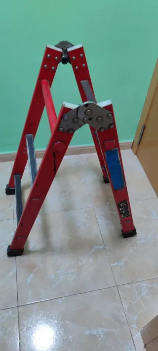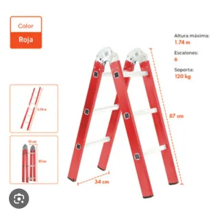 Escalera plegable de color rojo, ideal para trabajos en casa o en el jardín. Su diseño permite guardarla fácilmente. - Estructura de metal resistente. - Peldaños antideslizantes. - Bisagras de seguridad.