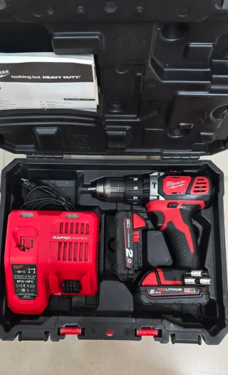 Taladro percutor inalámbrico Milwaukee M18 BPD. - Incluye cargador rápido. - Dos baterías M18 REDLITHIUM. - Maletín de transporte.