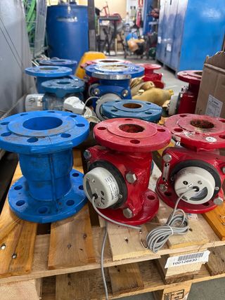 Se vende lote de contadores de agua de diferentes tamaños y colores. Ideales para proyectos o repuestos. - Contadores de agua de varias medidas. - Colores: azul y rojo. - Incluye piezas con conexiones de brida.
