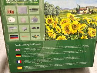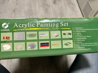Set completo de pintura acrílica CONDA para artistas. Incluye todo lo necesario para empezar a crear. - 1 caballete. - 1 lienzo pre-impreso de 40x50 cm. - 1 paleta de plástico. - 1 delantal. - 5 pinceles. - 12 tubos de pintura acrílica de 12 ml. - 1 lavapinceles. - 1 goma de borrar blanda. - 1 goma de borrar. - Lápices de colores y de dibujo afilados. - 1 sacapuntas. - 1 manual de instrucciones.