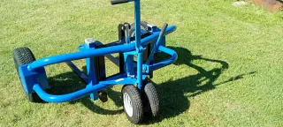 Transpaleta robusta de color azul, diseñada para trabajos en obra. - Ruedas resistentes para terrenos irregulares. - Manillar ergonómico para un mejor agarre. - Estructura de metal duradera.