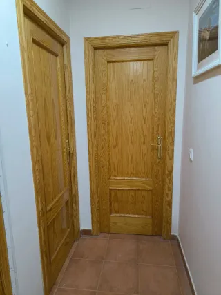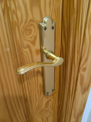 Conjunto de puertas de interior macizas de madera con un diseño clásico. Sin arañazos y se entregan completas con cercos y jambas. 60 euros la unidad, dispongo de 5 en total. Si te llevas las 5 en 250€ - Acabado en madera natural. - Diseño con paneles. - Tiradores dorados.