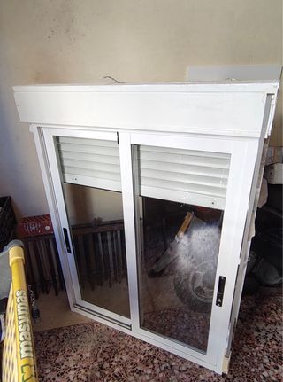 Ventana corredera de aluminio en color blanco. Tiene dos hojas con cristales climalit, cada una de 58x115 cm. Contiene persiana que funciona perfectamente, todo en buenas condiciones. Disponible a finales de marzo.