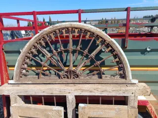 Set de tres ruedas para puertas correderas. Son piezas metálicas con un acabado rústico y algo de óxido, lo que les da un aspecto vintage. - Tres ruedas incluidas. - Material metálico. - Diseño robusto. - para puertas correderas de gran tamaño - se quitaron de una rehabilitación de un edificio antiguo
