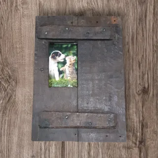 Pieza decorativa de madera con un estilo rústico y antiguo. Ideal para dar un toque vintage a tu hogar o negocio. - Marco de madera envejecida. - Barras metálicas decorativas.