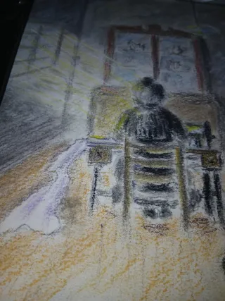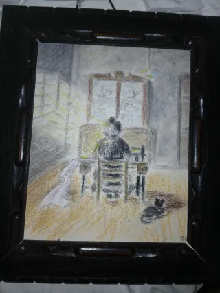 Pintura antigua realizada al pastel, representando a un pintor en su estudio. La obra muestra una escena interior con luz natural entrando por una ventana. Posiblemente AUTORRETRATO DEL PINTOR. - Técnica: Pastel. Firmado. - Motivo: Pintor en estudio. - Marco talla de madera oscuro.posiblemente roble ebanizado
