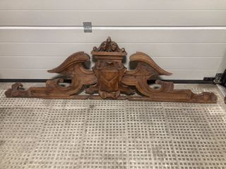 Talla en madera con diseño de frontón antiguo. Tipo de remate arquitectónico o decorativo comúnmente utilizado sobre puertas, ventanas o muebles grandes. Con iniciales "AR". Sus dimensiones son 108 cm de ancho por 32 cm de alto. - Medidas: 108 cm de ancho x 32 cm de alto. - Material: Madera. - Detalle central con escudo y monograma. - Adornos florales y volutas laterales.