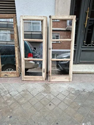 Conjunto de cuatro puertas antiguas de madera con paneles de cristal. - Diseño clásico con detalles en la parte inferior. - Marcos de madera clara. - Ideales para proyectos de restauración o decoración. -medidas de cada hoja 222 ×53'5 -se venden por pareja o las dos parejas -el precio por pareja sin restaiarar son de 225€