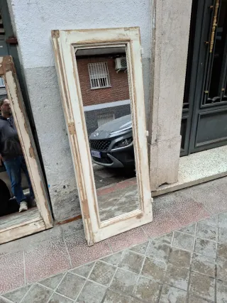 Conjunto de tres espejos antiguos con marcos de madera. - Marcos de madera en tonos beige y blanco. - Cristales de espejo. -medidas de cada espejo 153 × 63 cada espejo - se vende cada unidad a 160€