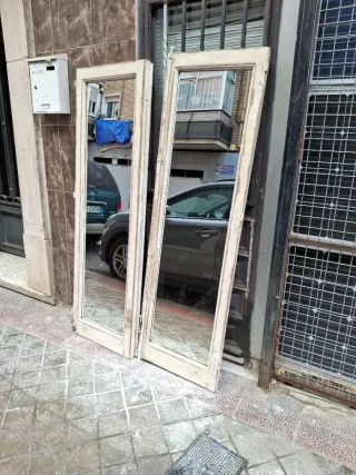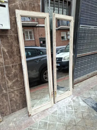 Conjunto de dos espejos antiguos con marcos de madera y cristal. - ventanas antiguas y acabado envejecido. - con todos sus herrajes de hierro antiguos de su epoca - Cristales con reflejo. - medidas de cada espejo 148 × 56'5 cada espejo - se vende por parejas o por unidad y la pareja valen 250€