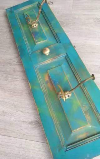 Este perchero decorativo combina madera y metal con un acabado desgastado. - Diseño con un gancho principal y un pomo. - Tonos verdes y dorados. Hecho de antigua ventana mallorquina.