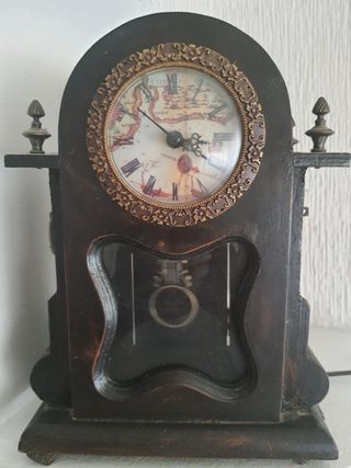 Elegante reloj de mesa con un diseño clásico y detallado. - Esfera con mapa náutico y números romanos. - Marco decorativo dorado. - Ventana frontal para ver el péndulo. - Acabado en madera oscura.