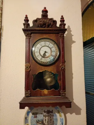 Este es un reloj de pared antiguo con un diseño clásico y elegante. - Mide 26 cm de ancho y 55 de alto - Marco de madera con detalles ornamentales. - Esfera con números romanos. -Funciona perfectamente - Ventana inferior para ver el péndulo.