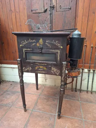 Incubadora antigua de petróleo. - Diseño de madera con detalles pintados. - Ventana frontal para observación. - Mecanismo superior. - Inscripción Since 1902.
