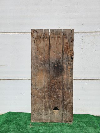 Preciosa puerta de madera y hierro, ideal para restaurar. Es una pieza única con mucho carácter. - Fabricada en madera maciza y hierro forjado. - Presenta un diseño rústico y antiguo. - Ideal para decoración o proyectos de bricolaje.