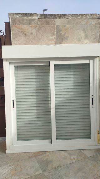 Balconera corredera con persianas integradas. Ideal para tu hogar. - Marco de aluminio blanco. - Persianas enrollables de lamas. - Puerta acristalada. 140x223 Precio por unidad