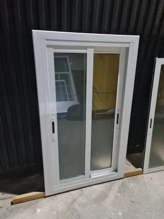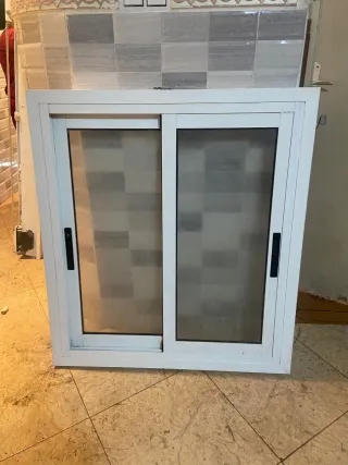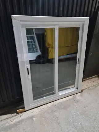 Ventana corredera de aluminio, ideal para tu hogar o proyecto. - 140 de ancho 120 de alto - Marco de aluminio blanco. - Dos hojas correderas. - Tiradores negros.